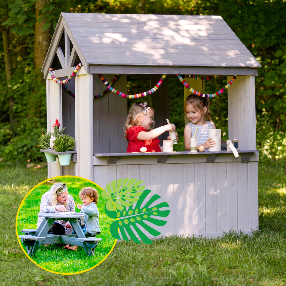 With incredible outdoor swing set combinations to choose from with slides, monkey bars, tunnels, sand boxes, picnic tables, forts, swings, jungle gyms, and so many more swing set accessories, your kids will want to play outside in the safety of your yard every day. The neighborhood hangout comes to your yard! Whether it's a compact set for smaller yards or a Mega Set for multiple families to enjoy, we have a playset for everyone. If you are looking for additional wooden play area accessories, our Jack & June line of toys features see saws, playhouses, toy chests, kids tables, and more.
