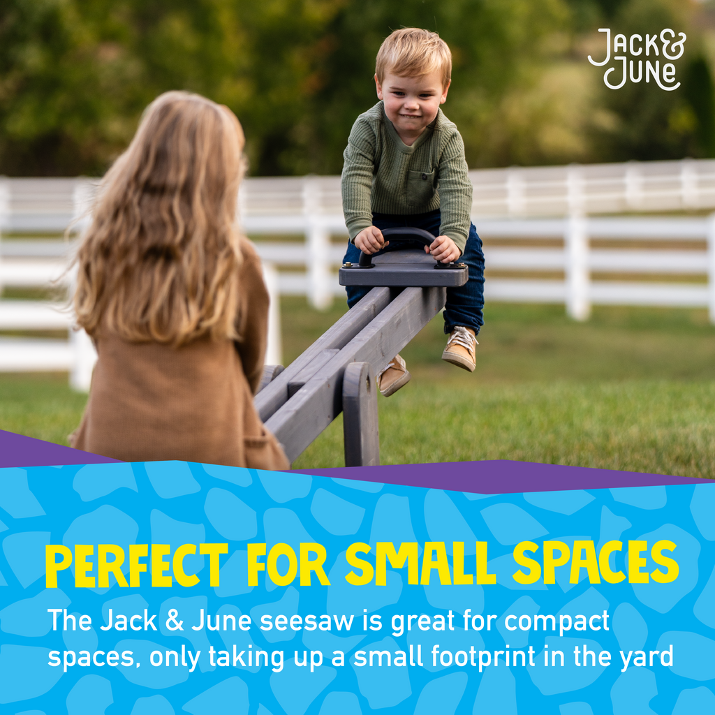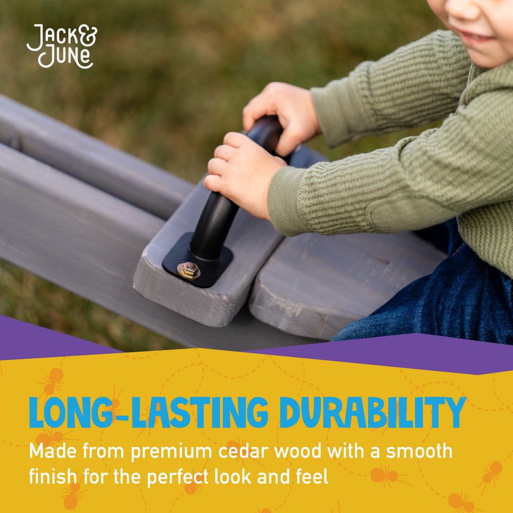Active, enriching play begins with the Jack & June Cedarwood Seesaw, expertly crafted from premium cedarwood for durability and natural beauty. Ideal for small, compact spaces, this seesaw adds engaging fun to any backyard while maintaining a safe environment. It features smooth, curved edges and a refined cedar finish to minimize risk during play. Designed for two children with a maximum weight limit of 120 lbs. per child, it ensures balanced and secure use. The set includes two sturdy handles and all necessary hardware, allowing for quick installation in just 15 to 20 minutes. Elevate your outdoor play area with this reliable and thoughtfully designed wooden seesaw. Shop for wooden seesaws today!