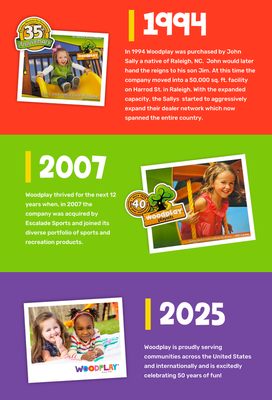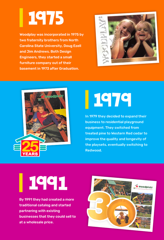 Learn about Woodplay Playsets through the years. Woodplay was incorporated in 1975 by two fraternity brothers from North Carolina State University, Doug Ezell and Jim Andrews. Both Design Engineers, they started a small furniture company out of their basement in 1973 after Graduation. In 1975 they were approached by the City of Raleigh parks department to design a commercial playset for a local park. This was the first Woodplay playset. They enjoyed the project so much, they pivoted from furniture to commercial playground equipment. Doug Ezell is the original designer of the cantilevered playset. This design is now a staple in the industry. In 1979 they decided to expand their business to residential playground equipment.