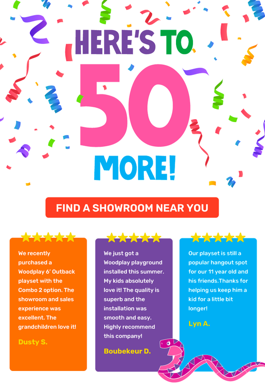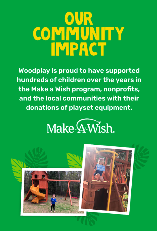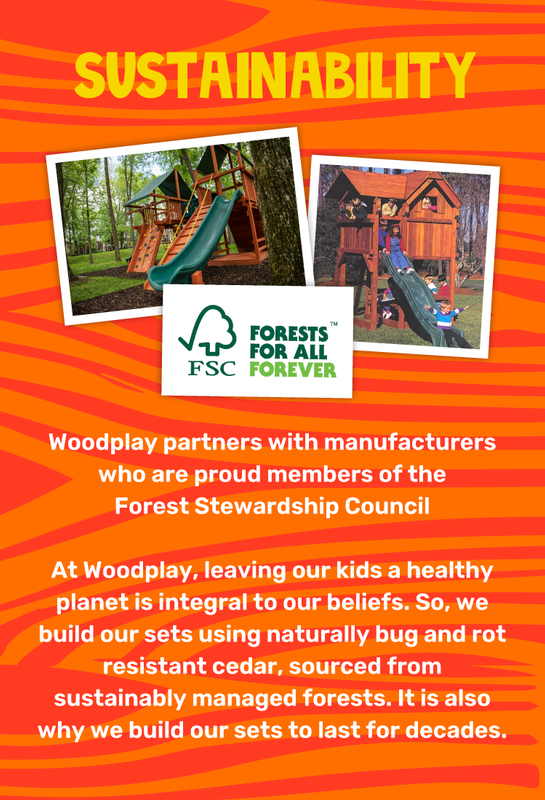 Woodplay continues to innovate through the years with bigger beams, smoother edges, safer play, plus the most Funnovations around. Woodplay is also proud to have supported hundreds of children through the years in the Make a Wish program, nonprofits, and the local communities with their donations of playset equipment. Woodplay partners with manufacturers who are proud members of the Forest Stewardship Council. At Woodplay, leaving our kids a healthy planet is integral to our beliefs. So, we build our sets using naturally bug and rot resistant cedar, sourced from sustainability managed forests. It is also why we build our sets to last for decades.